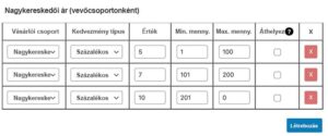 Mindegyik szint esetében, ugyanazon módon állíthatók be a kedvezmények. Nézzünk a vásárlói csoport szintű kedvezményekre egy példát.